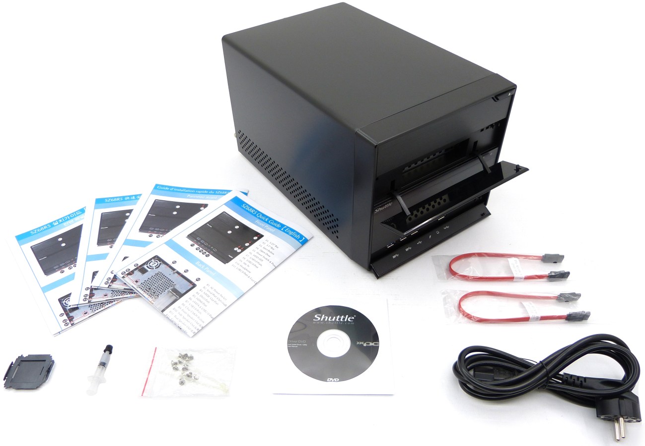 El modelo SZ68R5 viene presentado en el interior de una sencilla caja de cartón con asa bastante resistente y con decentes protecciones internas para el transporte. Tras un fácil desembalaje se accede a un sencillo cubo de metal de aluminio pintado en negro por fuera y de color gris aluminio por dentro. Viene con un kit de accesorios justo pero suficiente, con 2 cables SATA, compuesto térmico y tornillos de montaje. Además los 3 componentes vitales ya mencionados anteriormente: