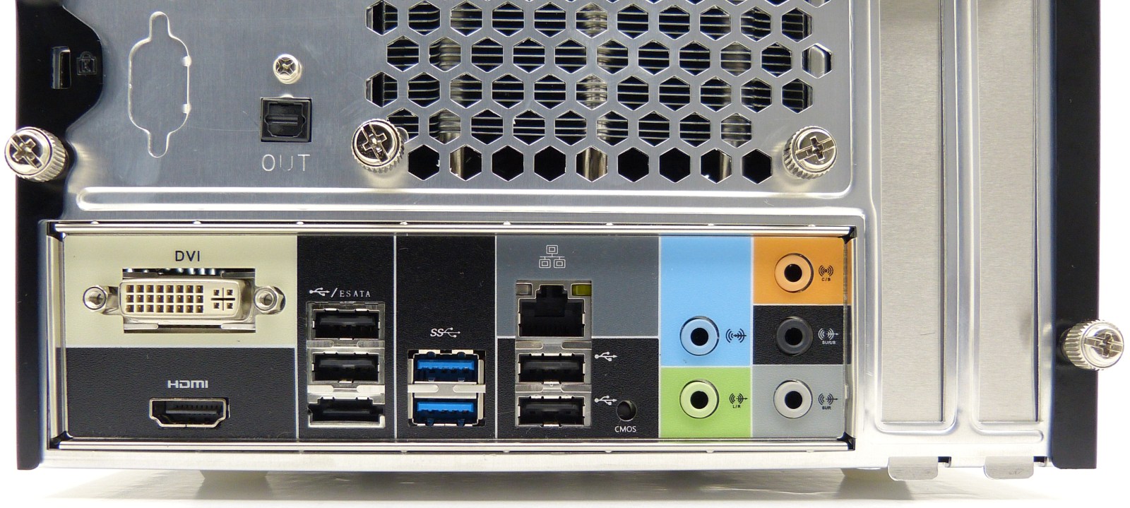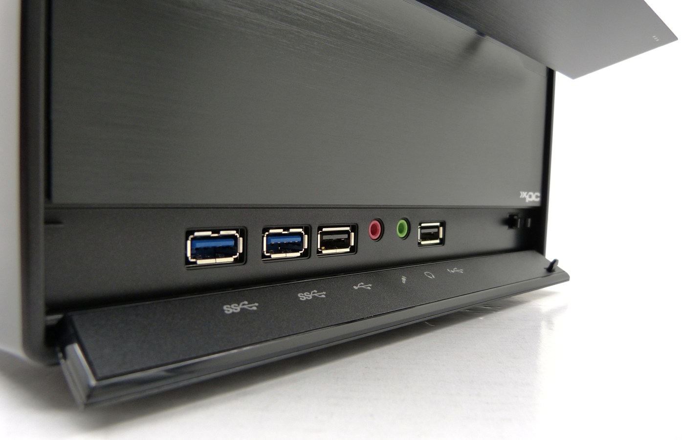 Por último, nos quedamos con los que más nos ha gustado: su diseño frontal y su panel trasero de conexiones. El panel frontal es totalmente cerrado, con 3 puertas abatibles en vertical, cada una de un diseño distinto que permite tener cerrado todo el frontal. Esto garantiza un aspecto distinguible y elegante del cubo, que lo hace apto para colocarse en cualquier tipo de entorno, sea ofimático o doméstico; seguro que dará el pego. El panel de conexiones delantero junto con el trasero disponen de un sin fin de conexiones de todo tipo para que no echar nada en falta, tanto en la transferencia de datos, audio o vídeo…