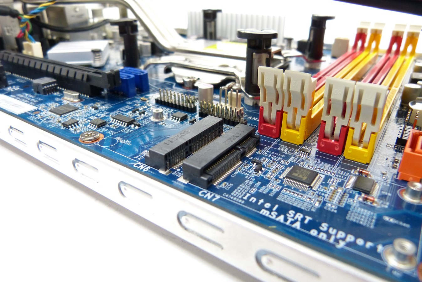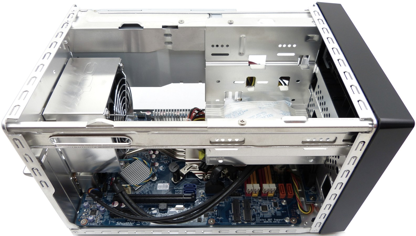 - Placa base Shuttle. Esta placa base posee un socket de intel 1155, 4 bancos de memoria a 1333MHz hasta los 32GB de capacidad (4x8GB) en configuración de doble canal y 2 zócalos PCIe, uno x16 y otro x4. Se puede equipar cualquier procesador Sandy Bridge 1155 de hasta 95W, y con la última versión de su BIOS AMI (la SZ68R000.201) se puede equipar cualquier procesador Ivy Bridge, dando compatibilidad a la última generación de procesadores Intel. Además, también se puede equipar una tarjeta gráfica de mediana potencia, que no ocupe más de 2 zócalos y que no tenga una dimensión en longitud demasiado elevada, y que recomendamos no supere los 150W de potencia y que disponga de un sistema de refrigeración propia decente.