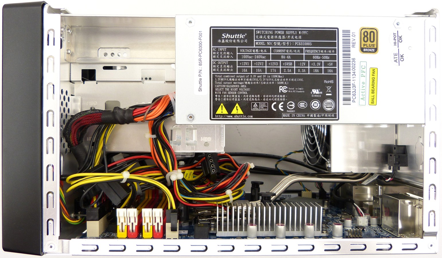 - Fuente de alimentación Shuttle de 500W y certificada con 80Plus Bronze. Dispone de 3 raíles de +12V, dividiendo así la intensidad total de salida de corriente continua. Es por ello que no es compatible con tarjetas gráficas de gran potencia. Trae incluido su cable de alimentación de CA. Este tipo de fuentes es relativamente difícil de conseguir en comparación al formato ATX, que está mucho más expandido en el mercado. Por tanto, el hecho que el equipo venga con una fuente ya premontada es de agradecer, aunque quizá sea la que justifique su precio final, y es que este tipo de fuentes suelen ser bastante caras en comparación a las fuentes ATX, simplemente por la reducción de tamaño y disponibilidad en el mercado.