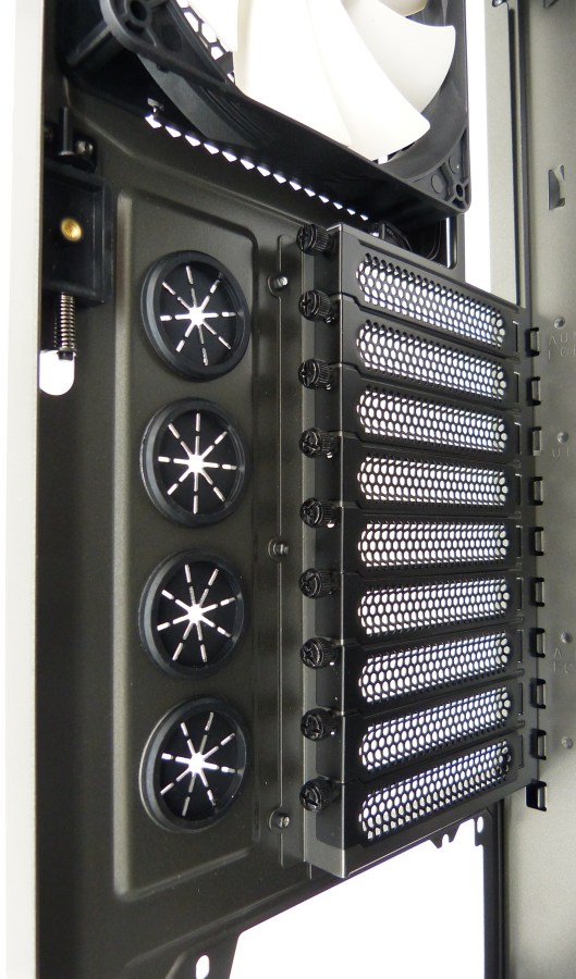 Para las placas metálicas traseras PCI no se ha empleado ningún sistema de fijación especial. Los típicos tornillos de cabeza gruesa son más que suficientes para ficar cada una de las 9 disponibles. Gracias al gran espacio interior, se puede equipar hasta 4 tarjetas gráficas, o incluso 3 que ocupen cada una de ellas 3 slots, siempre que la placa base sea compatible.