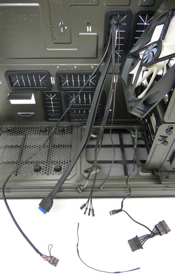 Respecto al cableado tenemos los 4 típicos conectores para el F_Panel de la placa base; LED de actividad de las unidades de almacenamiento de datos, LED de encendido, para botón de reinicio y para botón de encendido/apagado. Además dispone de los 2 cables para los 2 puertos USB 2.0 y del cable para los 2 puertos USB 3.0, con conexión interna a la placa base. Por último, dispone de un cable con conectores planos para la pequeña lectora de tarjetas SD del panel frontal. Este tipo de conector se supone que va conectado a la placa base, pero desconocemos dicho puerto. Es de suponer que irá asomando en las futuras placas base, conforme lo ha hecho el puerto USB 3.0.