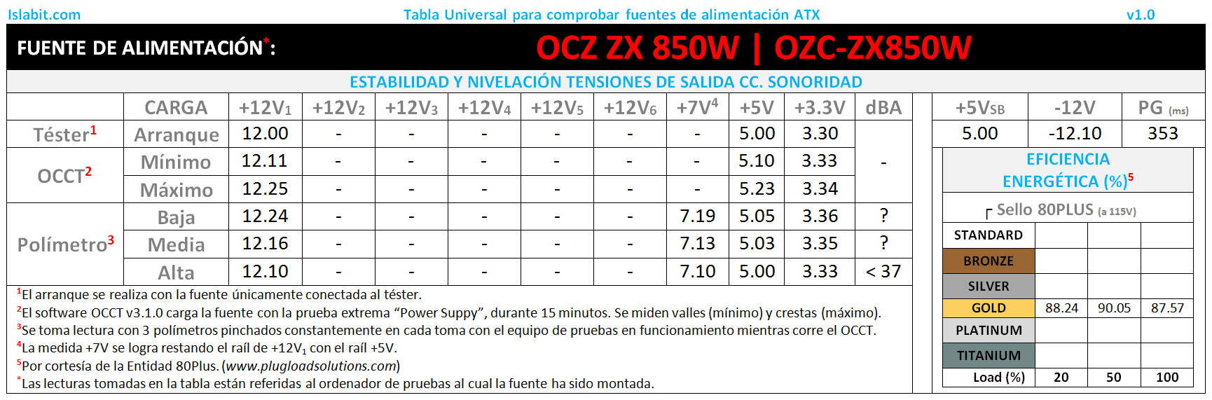 OCZ ZX 850W. Tabla Estabilidad y Nivelación Tensiones Salida CC. Sonoridad. Eficiencia Energética
