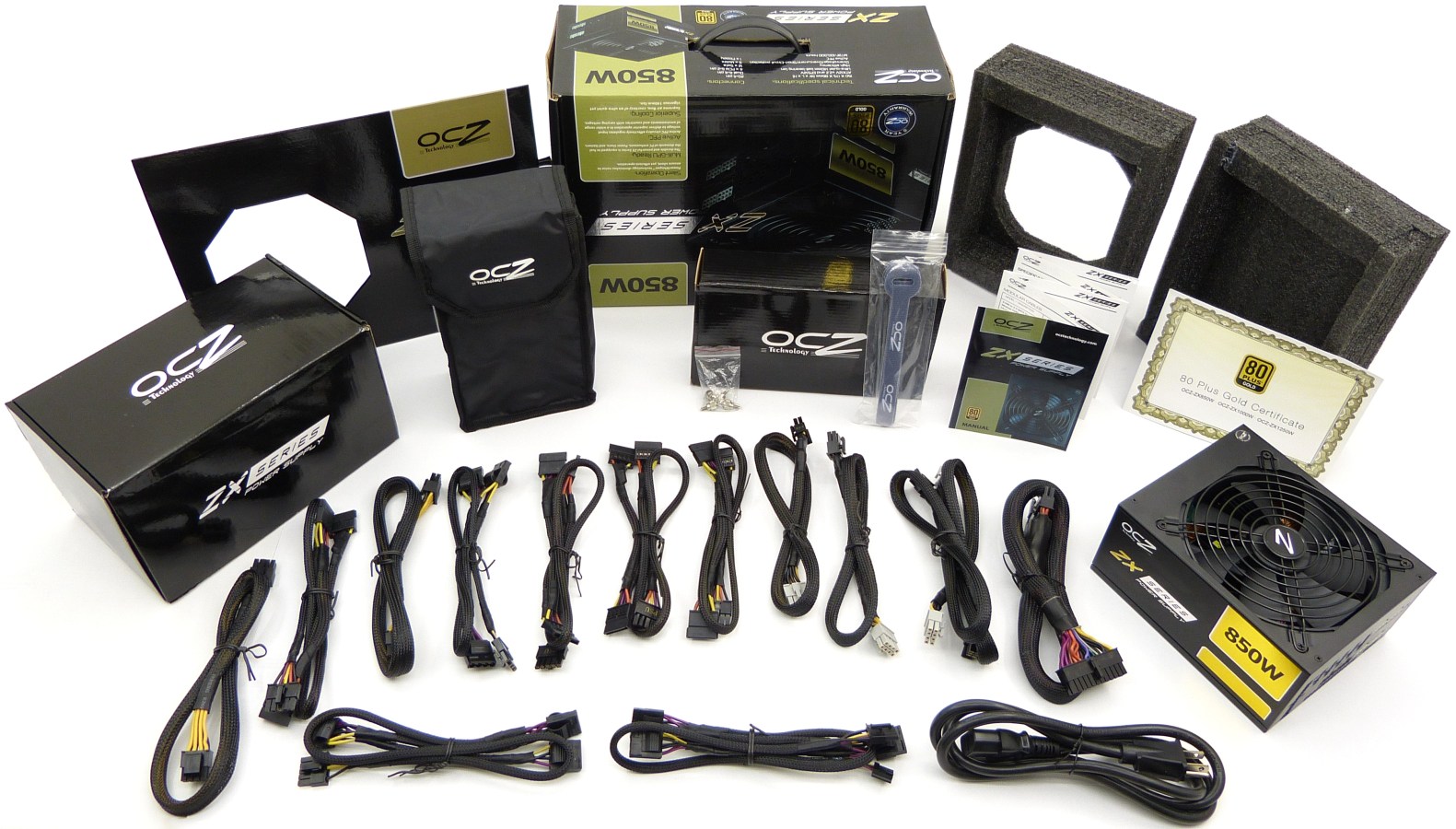 El modelo ZX de 850W, viene presentado a través de un embalaje digno de la gama alta, con excelentes protecciones tanto para la propia fuente, como para el resto de componentes y accesorios. Si observamos toda su equipación, la primera característica llamativa es su cableado 100% modular, incluyendo el cableado destinado a alimentar la placa base. Esta característica es también común a la serie ZT, perteneciente a la categoría «High Performance», en general algo inferior a la categoría de la serie ZT. Todos los componentes vienen en el interior de una pequeña caja de cartón, que acompaña a las protecciones internas de la fuente de alimentación. En dicha caja, se encuentra todo el cableado modular introducido en un práctico estuche con cierre de velcro, algo que no puede faltar en las fuentes modulares. Además, incluye un pequeño kit de 5 cintas de velcro para atar los cables, algo que siempre es mas adecuado que las típicas bridas, que son de un solo uso.