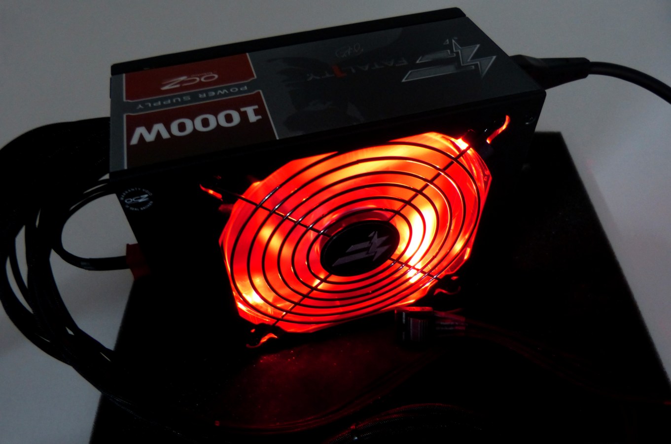 OCZ FATAL1TY 1000W. Detalle Efecto Modding Luminoso de los LEDs Rojos del Ventilador