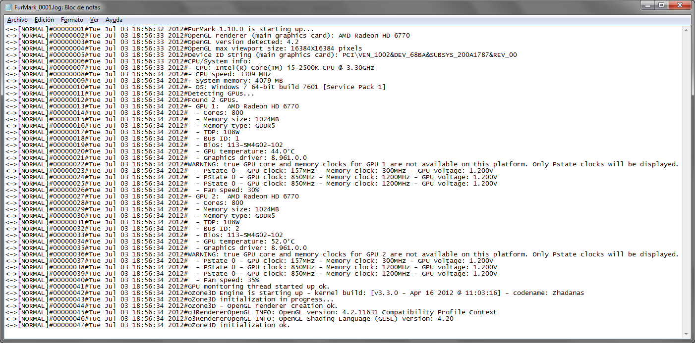 ZALMAN HD6770-Z VF902 Black Pearl. Captura FurMark v1.10. Archivo Log Previo a Prueba de Estrés