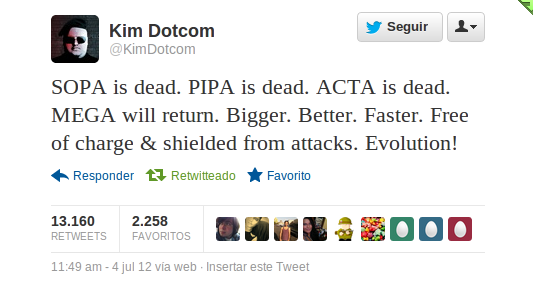 Como se puede apreciar en la imagen anterior, Dotcom a través de su perfil en la red social Twitter menciona que Megaupload volverá, exactamente con las palabras: «SOPA está muerta. PIPA está muerta. Ahora ACTA está muerta. MEGA volverá. Más grande. Mejor. Más fuerte. Sin ningún costo y blindada celebra el rechazo de ACTApara los ataques. ¡Evolución!»