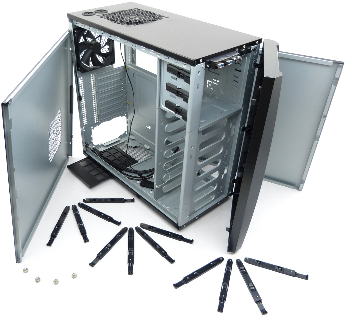 Aunque esta caja parezca del montón, dispone de múltiples características que a simple vista pueden pasar algo inadvertidas. La forma de desabatir su frontal a modo de puerta después de desanclar las tres pestañas del lateral izquierdo es un aspecto muy gustoso, además de añadir un aro trasero para cerrar con candado la tapa metálica lateral izquierda e impedir tanto que se abra como para impedir que alguien se lleve la semitorre de su sitio, viniendo ambas tapas laterales armadas con 4 tornillos de calidad con cabeza manual. Sus cuatro patas también son destacadas, que pese a que el chasis en general no dispone de ningún sistema antivibración, las patas ayudan a no transmitir la vibraciones a través de ellas. El resto lo completa un chasis metálico tipo SECC de gran robustez (reuniendo un peso total de casi 7Kg pelada), los 2 ventiladores de 120 y 140mm instalados en la trasera y lomo de los 6 posibles a instalar, así como dos reguladores de doble posición para las RPM de cada ventilador ya instalado.
