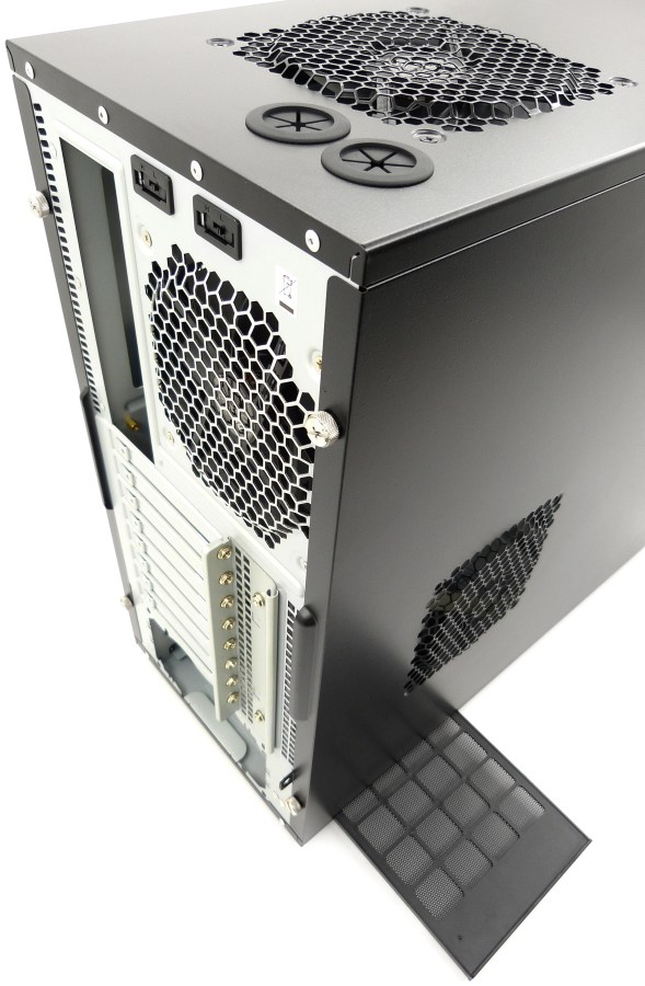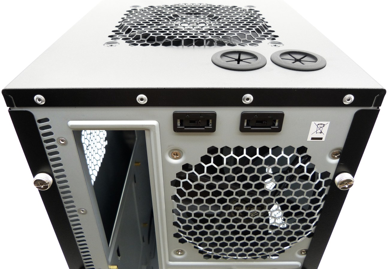 ANTEC THREE HUNDRED TWO. Detalle Lomo y Trasera. Ventilación de Salida, Pasatubos RL y Panel de Control RPM Trasero (2 interruptores de doble posición)