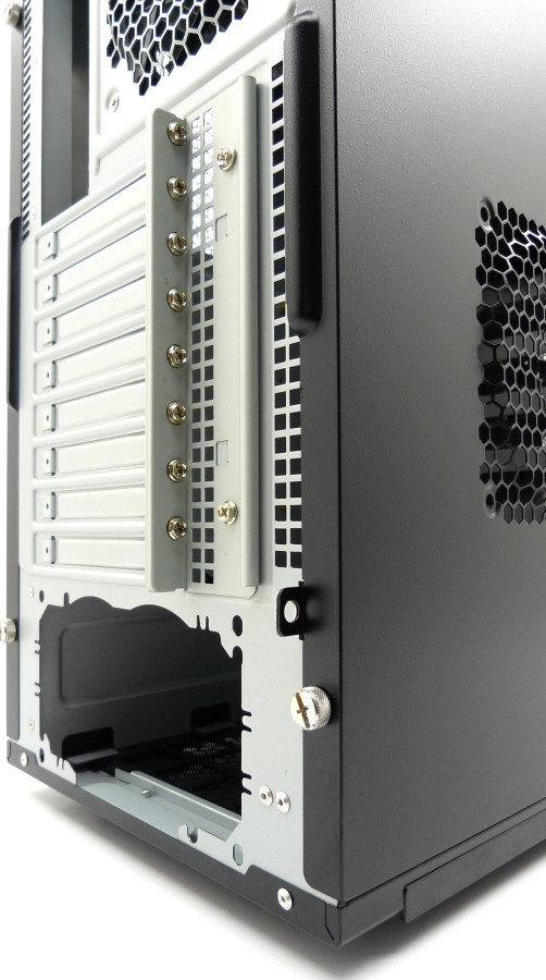 ANTEC THREE HUNDRED TWO. Detalle Placas Metálicas Reutilizables en 8 Ranuras de Expansión PCI/PCIe. Detalle Cierre Anillo para Candado