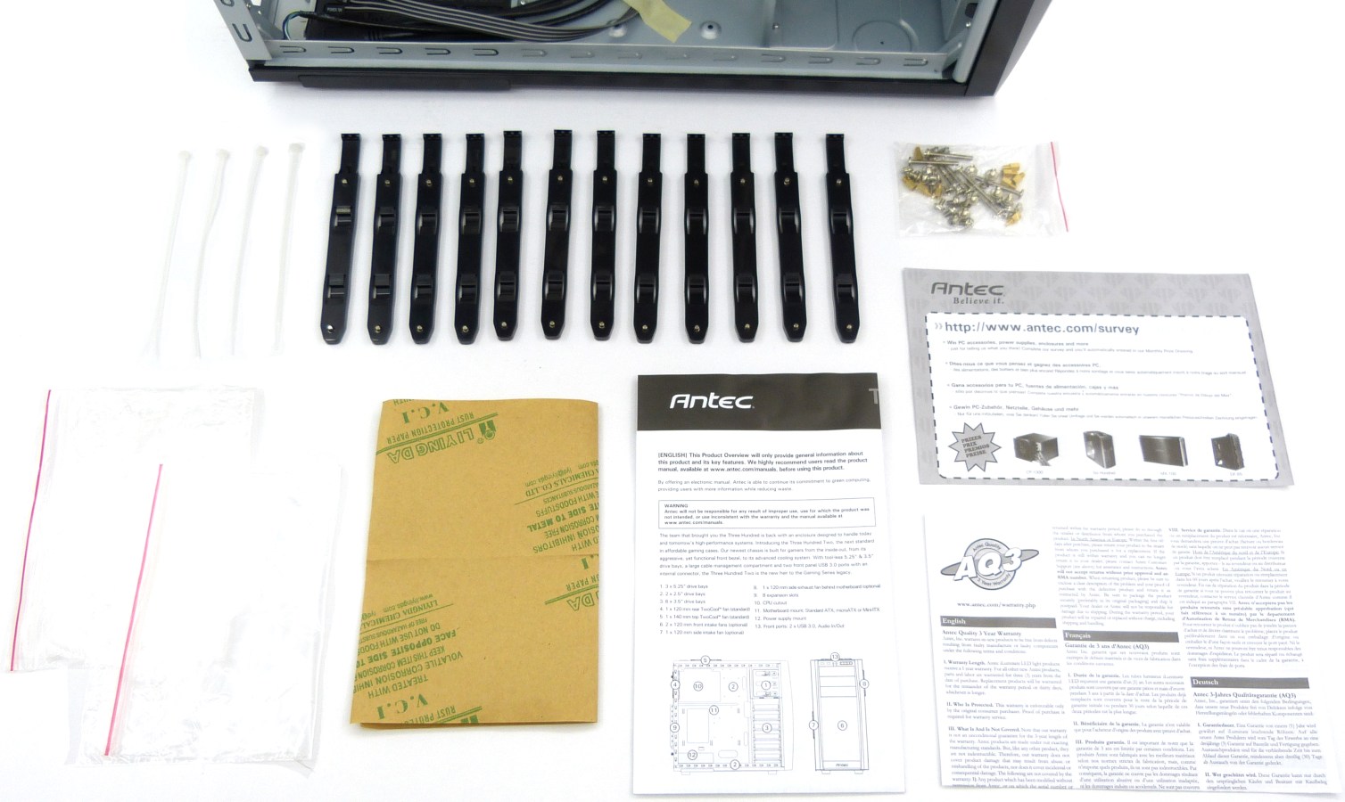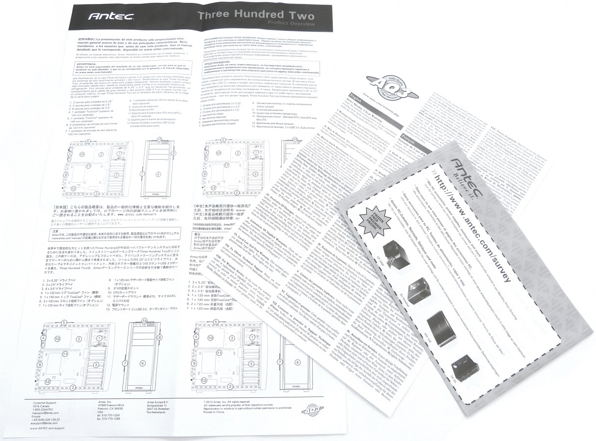ANTEC THREE HUNDRED TWO. Detalle Manual de Usuario Desplegado Multiidioma + Folletos de Información y Garantía de Antec