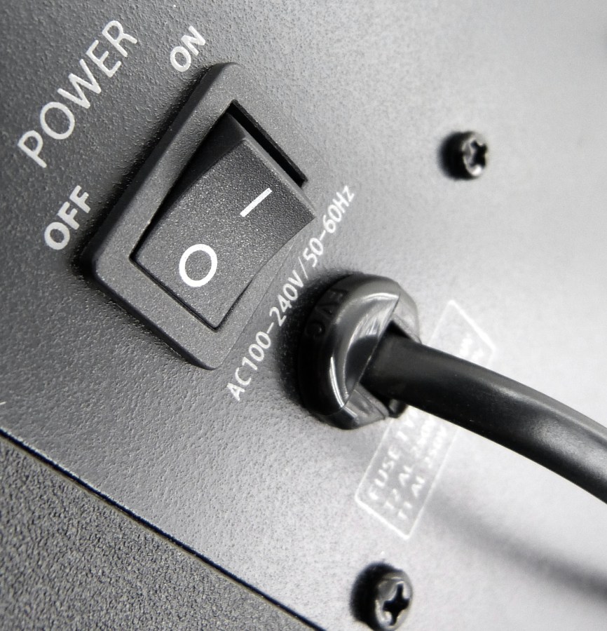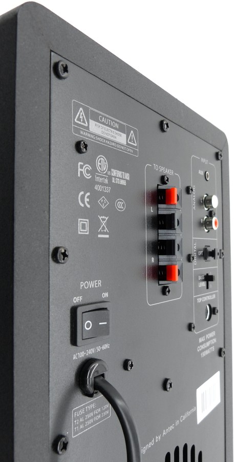 SOUNDSCIENCE ROCKUS 3D 2.1. Detalle Interruptor de Encendido/Apagado del amplificador del Altavoz Subwoofer Activo. Detalle entrada cableado de alimentación de CA a 100-240V/50-60Hz. Fusible Internos de Seguridad.