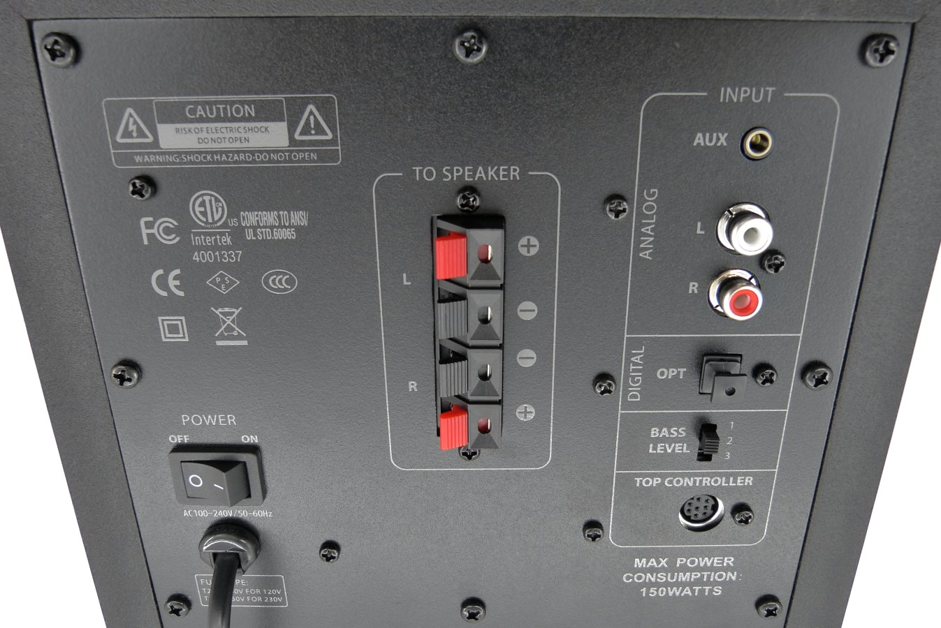SOUNDSCIENCE ROCKUS 3D 2.1. Detalle en Perspectiva Panel de Control y Conexiones Trasero