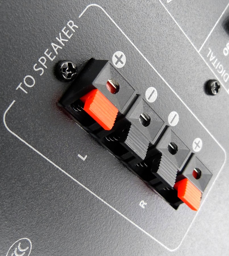 SOUNDSCIENCE ROCKUS 3D 2.1. Detalle Conectores de Salida Estéreo para Satélites. 2 parejas de Conectores Izquierdo y Derecho (positivo más neutro)