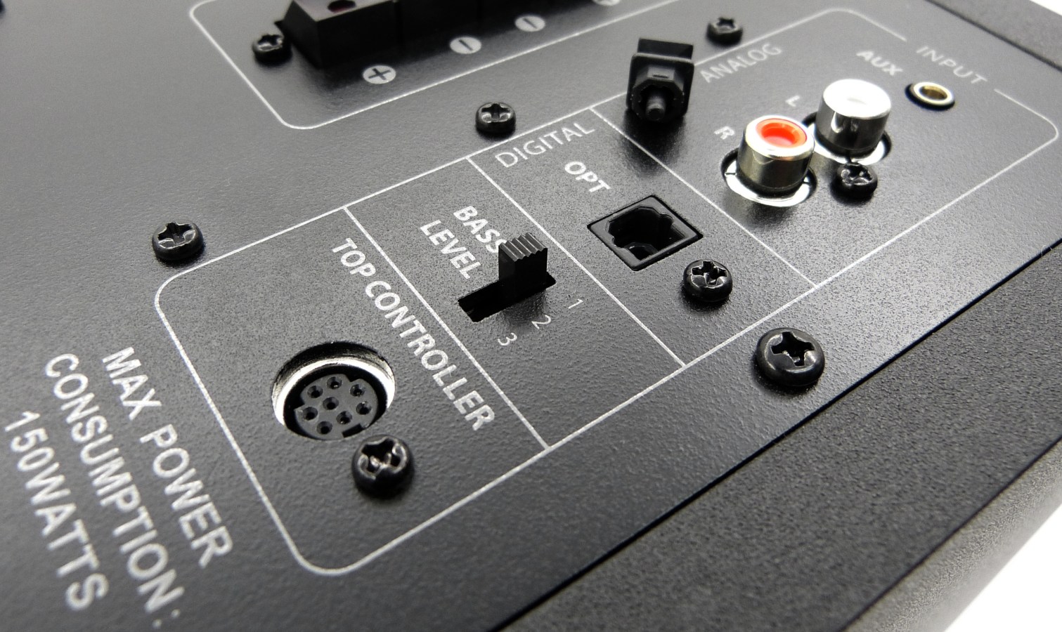 SOUNDSCIENCE ROCKUS 3D 2.1. Detalle Conectores de Entrada Auxiliar Estéreo 1 jack de 3.5mm + Entrada Analógica Estéreo 2 RCA + Entrada Digital Óptica. Detalle Interruptor de triple posición «Bass Level» con 3 Niveles de bajos. Detalle Conector de 8 contactos de Entrada/Salida para Consola de Control Remoto.