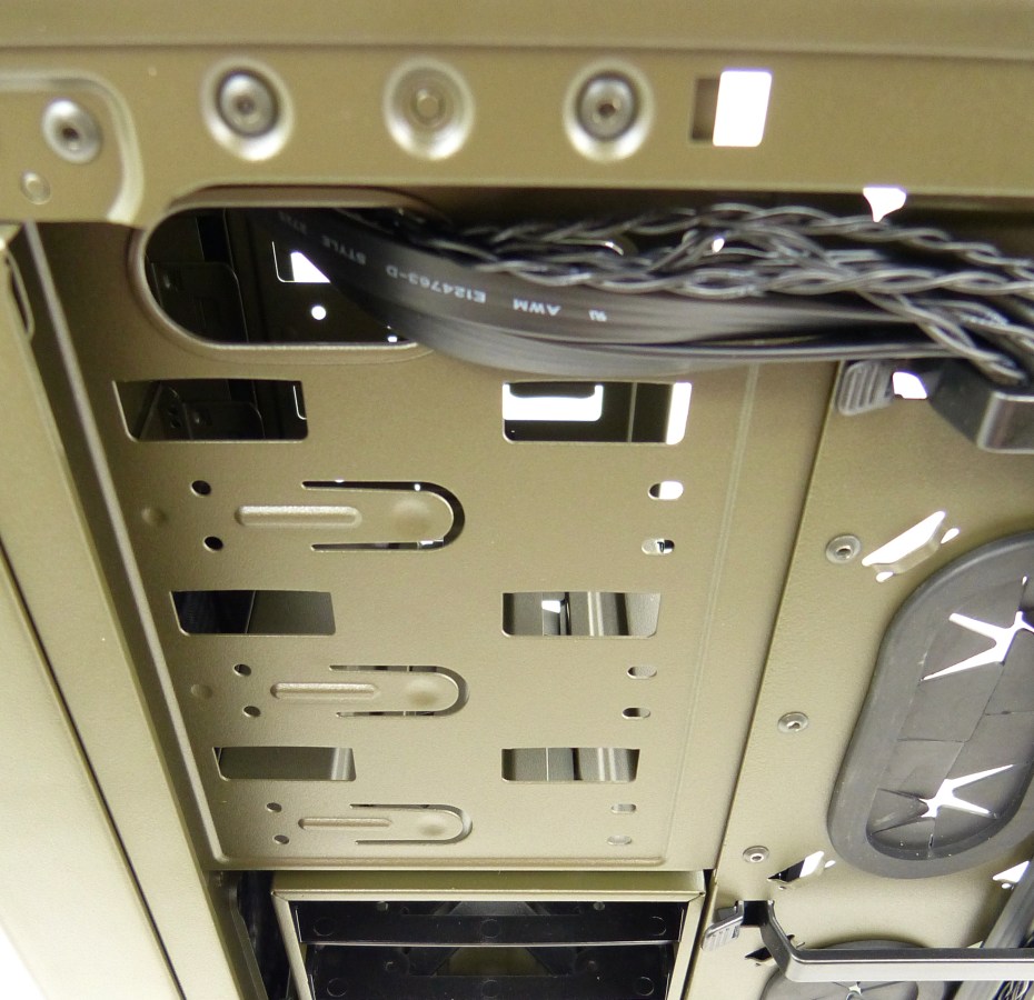 CORSAIR VENGEANCE C70 MILITARY GREEN. Semitorre Vista Interior Derecha Zona Bahías de 5.25″. Salida del Cableado Frontal