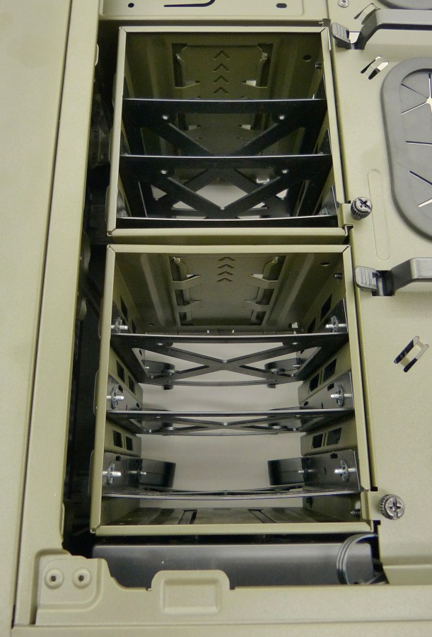 CORSAIR VENGEANCE C70 MILITARY GREEN. Semitorre Vista Interior Derecha Zona Bahías de 3.5″/2.5″ (x6). Tornillos de Fijación de cada Compartimento