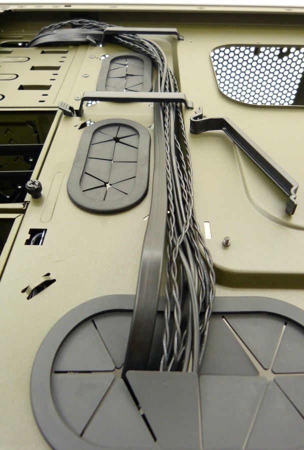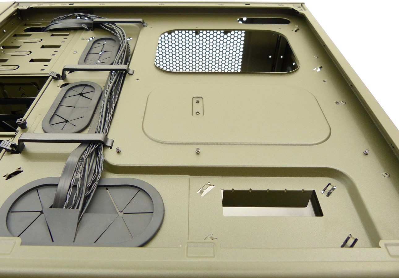 CORSAIR VENGEANCE C70 MILITARY GREEN. Detalle Zona Gestión del Cableado. 3 Perforaciones de Paso. 3 Clips de fijación Extraíbles. Ventanal para Instalación Disipador CPU de Grandes Dimensiones