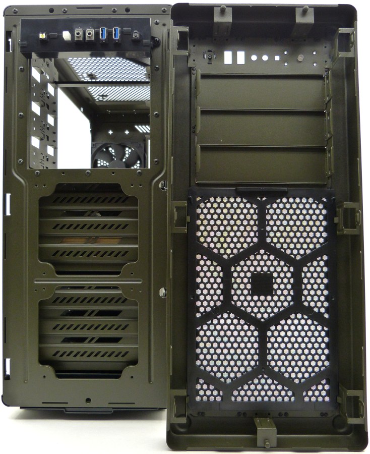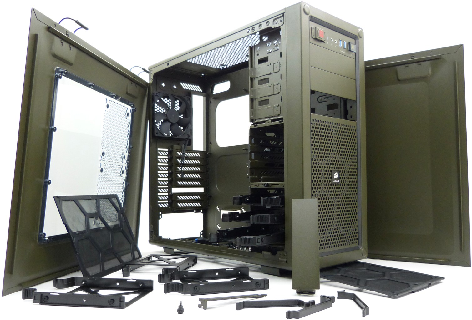 CORSAIR VENGEANCE C70 MILITARY GREEN. Detalle Desarme Frontal. Vista Interior Frontal. 2 Ventiladores de Introducción de 120/140mm (Opcional)
