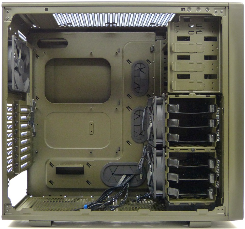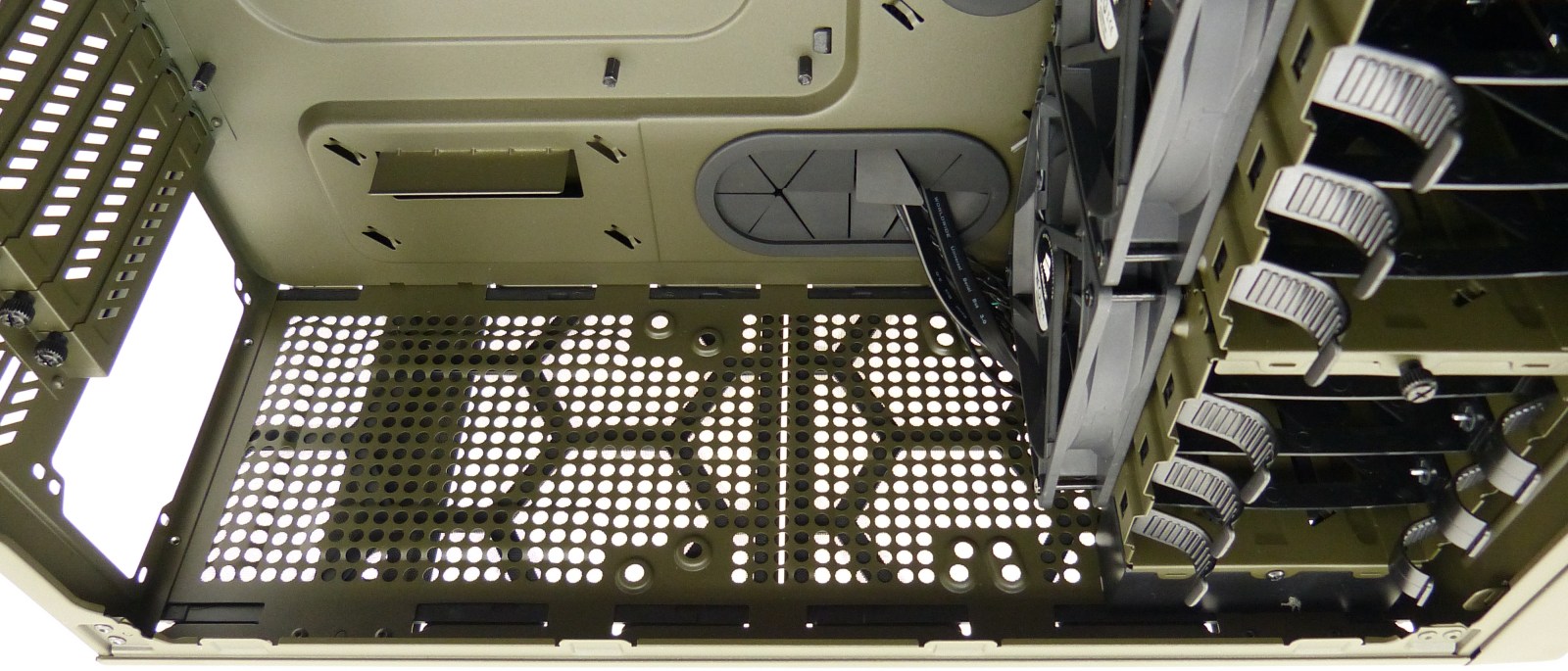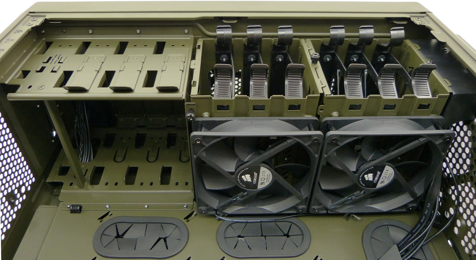 CORSAIR VENGEANCE C70 MILITARY GREEN. Semitorre Vista Interior Izquierda Zona Delantera. 3 Bahías de 5.25″. 3 + 3 Bandejas extraíbles para Dispositivos de 3.5″/2.5″ (2 Compartimentos Extraíbles)