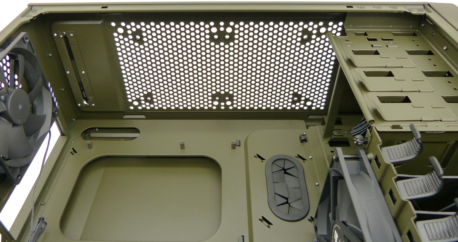 CORSAIR VENGEANCE C70 MILITARY GREEN. Semitorre Vista Interior General Lateral Izquierda. Zona Placa Base (ATX, microATX)