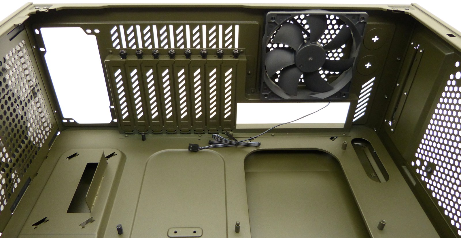 CORSAIR VENGEANCE C70 MILITARY GREEN. Semitorre Vista Interior Izquierda Zona Trasera. Ventilador de Extracción de 120mm (incluido). 8 Ranuras de Expansión PCI/PCIe