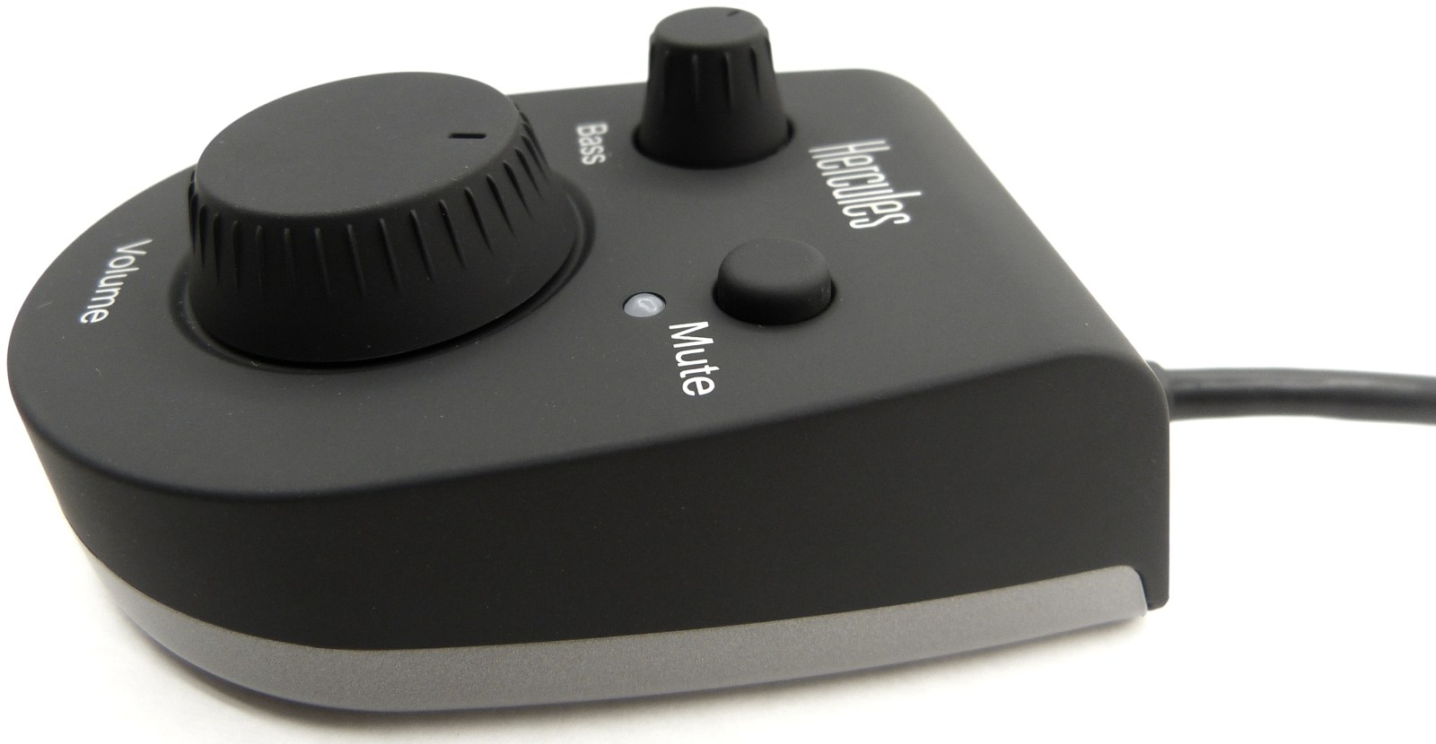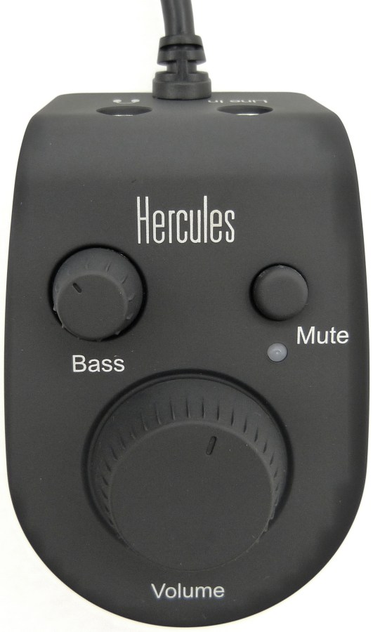 HÉRCULES XPS 41. Mando a Distancia Vista Superior. Detalle Ruedas Giratorias finitas, de Bajos («Bass») y Volumen («Volume»). Detalle Botón de doble posición de Silencio («Mute»). LED de estado (Apagado, Encendido y Silencio)