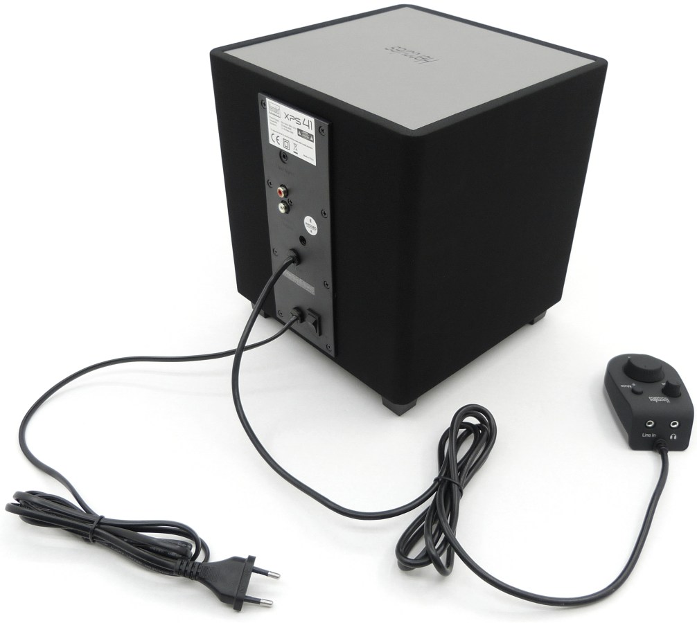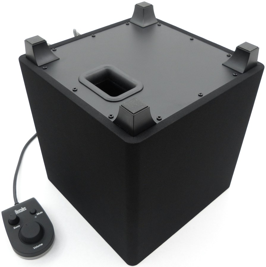HÉRCULES XPS 41. Altavoz Subwoofer Activo. Vista en Perspectiva Superior. Cable de Alimentación y Mando a Distancia con cable Directo