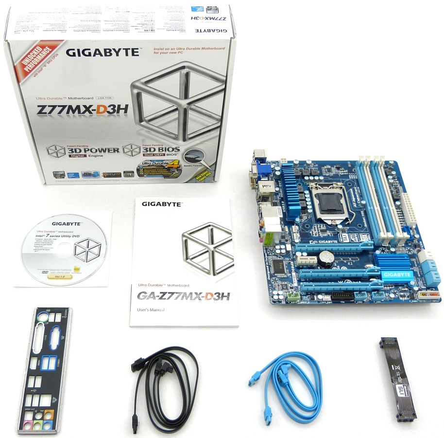 Como de costumbre, Gigabyte presenta sus placas base de manera impoluta y llamando poderosamente la atención. Esta vez, tenemos la ocasión de revisar la GA-Z77MX-D3H, una placa base en formato micro ATX que viene en un embalaje que tras un fondo blanco resalta «la fiebre del 3D» de sus 3 tecnologías más recientes, 3D Power Diginal Engine, 3D BIOS con Dual UEFI (de lo mejor de este modelo) y el 333 Onboard Acceleration, reforzada con su tecnología en la electrónica UltraDurable4 Classic, además de venir equipada con el chipset Z77, con soporte para Lucid Universal MVP para aprovechar la IGPU integrada en los procesadores de Intel de 22nm Ivy Bridge, además de soportar configuraciones en SLI o Crossfire a 2 por x8 y acompañada del procesador de audio de VIA. Este es el resumen de lo que representa esta placa base, que en aspecto recuerda a los modelos más afamados de la marca, con el fondo azul marino como protagonista.
