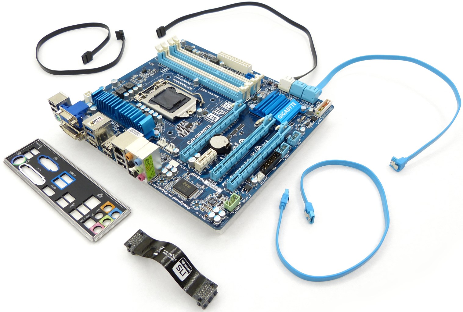 Los accesorios que acompañan a la microATX son los justos y necesarios para una mínima conexión. A destacar lo detallado que viene la placa metálica para cubrir el panel trasero de conexiones, con los nombres y colores para identificar cada puerto. Trae el típico manual de instrucciones, únicamente traducido al inglés, como de costumbre (para los fabricantes de placas base en general no existe otro idioma que no sea el inglés para traducir sus manuales), además de incluir el DVD con software, que a veces viene bien por si no podemos encontrar los últimos drivers en Internet. Por último, trae un puente SLI, sin traer ninguno para Crossfire, que recordamos que es distinto.