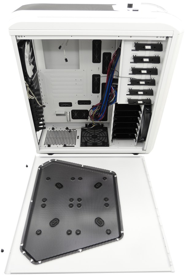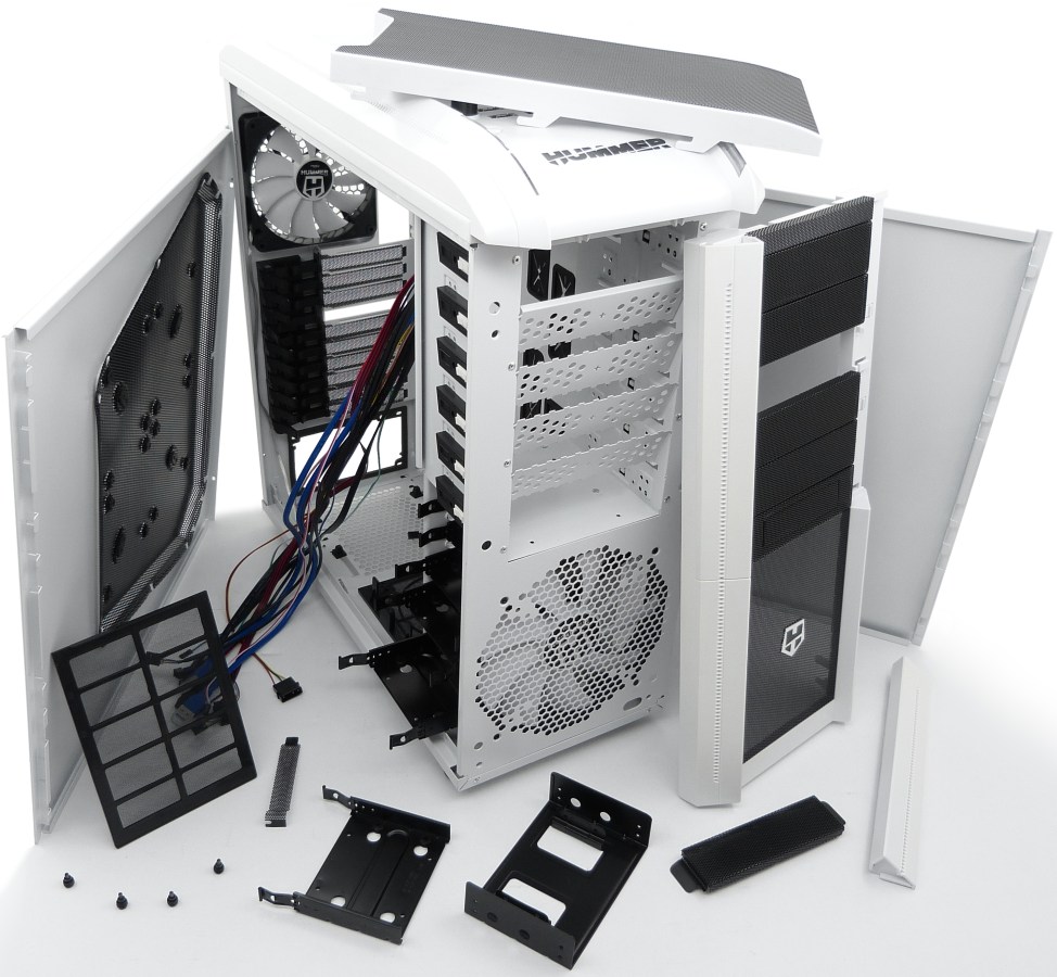 El resto de características de la Hummer Zero son idénticas a la Hummer, destacando su frontal desmontable de plástico ABS, separable de la estructura metálica de acero tipo SECC, su lomo desmontable en 2 partes también de ABS con rejilla Mesh, su amplia rejilla lateral microperforada tipo Mesh con capacidad de hasta 4 ventiladores de 12cm o 1 de 20 o 25cm, el buen diseño de la zona de la fuente de alimentación, con 4 amortiguadores/soporte debajo y marco trasero, además de su gran capacidad para montar cualquier tipo de placa base, incluso los formatos más grandes E-ATX y XL, con la capacidad de soportar largas tarjetas gráficas de hasta 330mm de longitud, 3 o incluso 4, gracias a sus 10 ranuras de expansión PCI/PCIe y capacidad también para altos y amplios disipadores para CPU, según resto de componentes. El resto lo completan su columna frontal, con 6 bahías de 5.25″ externas, una de ellas con adaptador a 3.5″ y su sistema por bandejas y con antivibraciones para hasta 6 dispositivos de almacenamiento versátiles para 3.5″ o 2.5″. Por último, cabe destacar su zona habilitada para la gestión del cableado y su clara refrigeración activa de hasta 4 ventiladores, con la posibilidad de controlados manualmente por el usuario a través de sus 2 canales, ofreciendo mejor relación rendimiento/sonoridad.