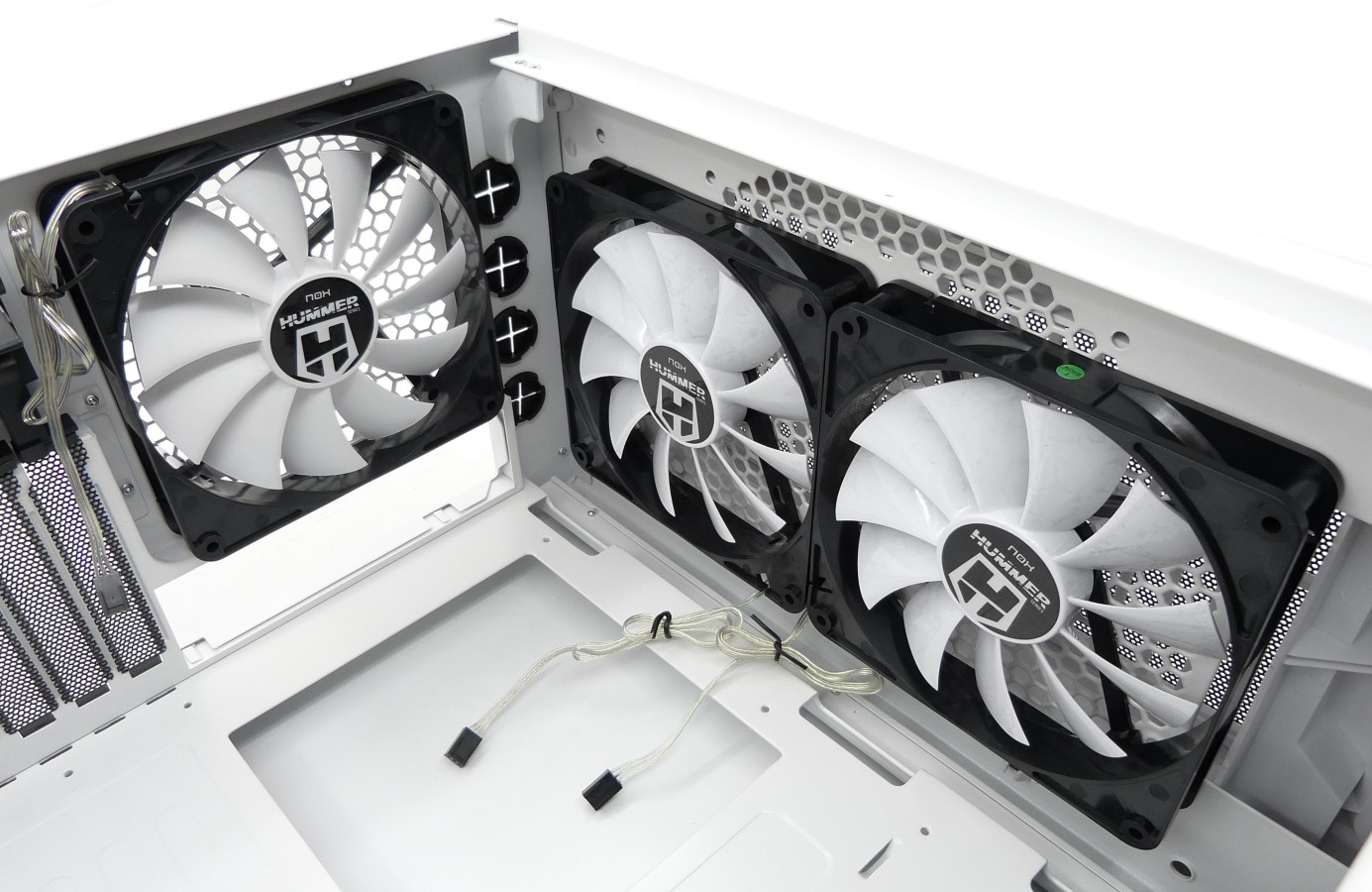NOX XTREME HUMMER ZERO. Detalle Ventiladores Preinstalados de 140mm (x3). Conectores de Alimentación de 3 Contactos