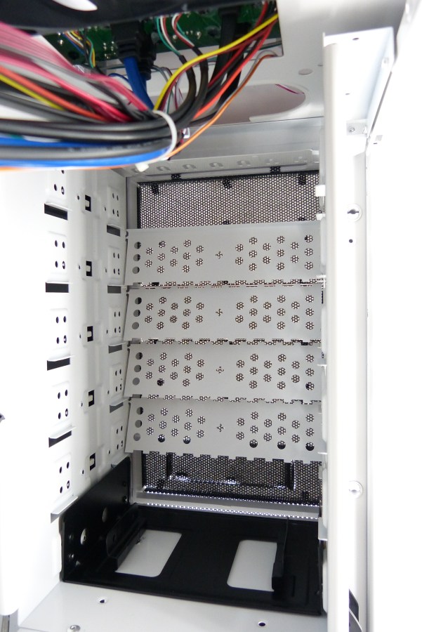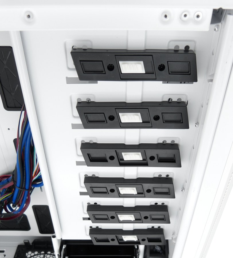 NOX XTREME HUMMER ZERO. Detalle Interior Bahías de 5.25″ (x6). Detalle Adaptador de 5.25″ a 3.5″ Preinstalado (x1), con Tapa Frontal También con Adaptador