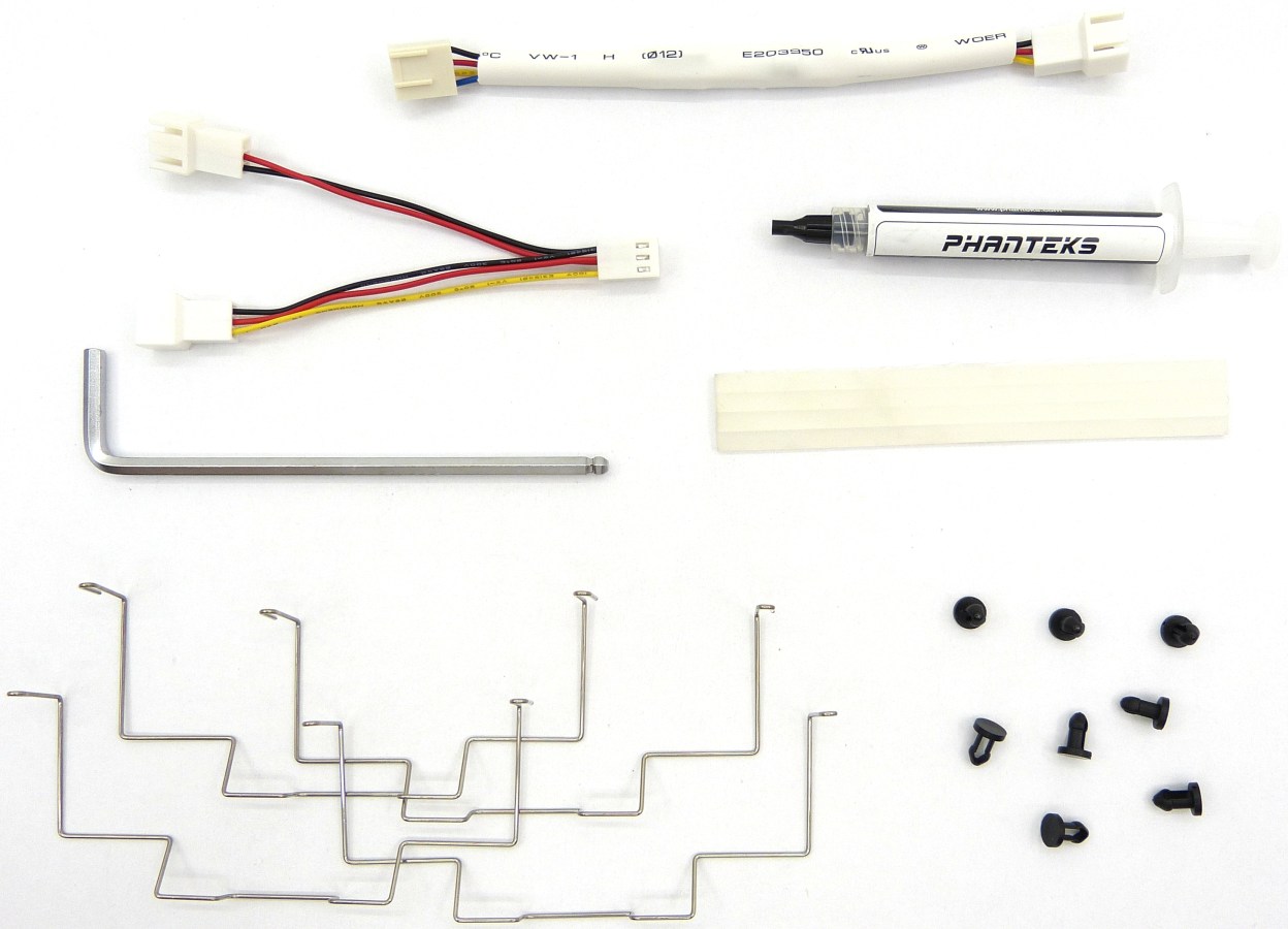 PHANTEKS PH-TC14CS. Detalle Accesorios. Cables adaptadores, Compuesto Térmico, Herramienta en L y Accesorios para Montar 2 Ventiladores