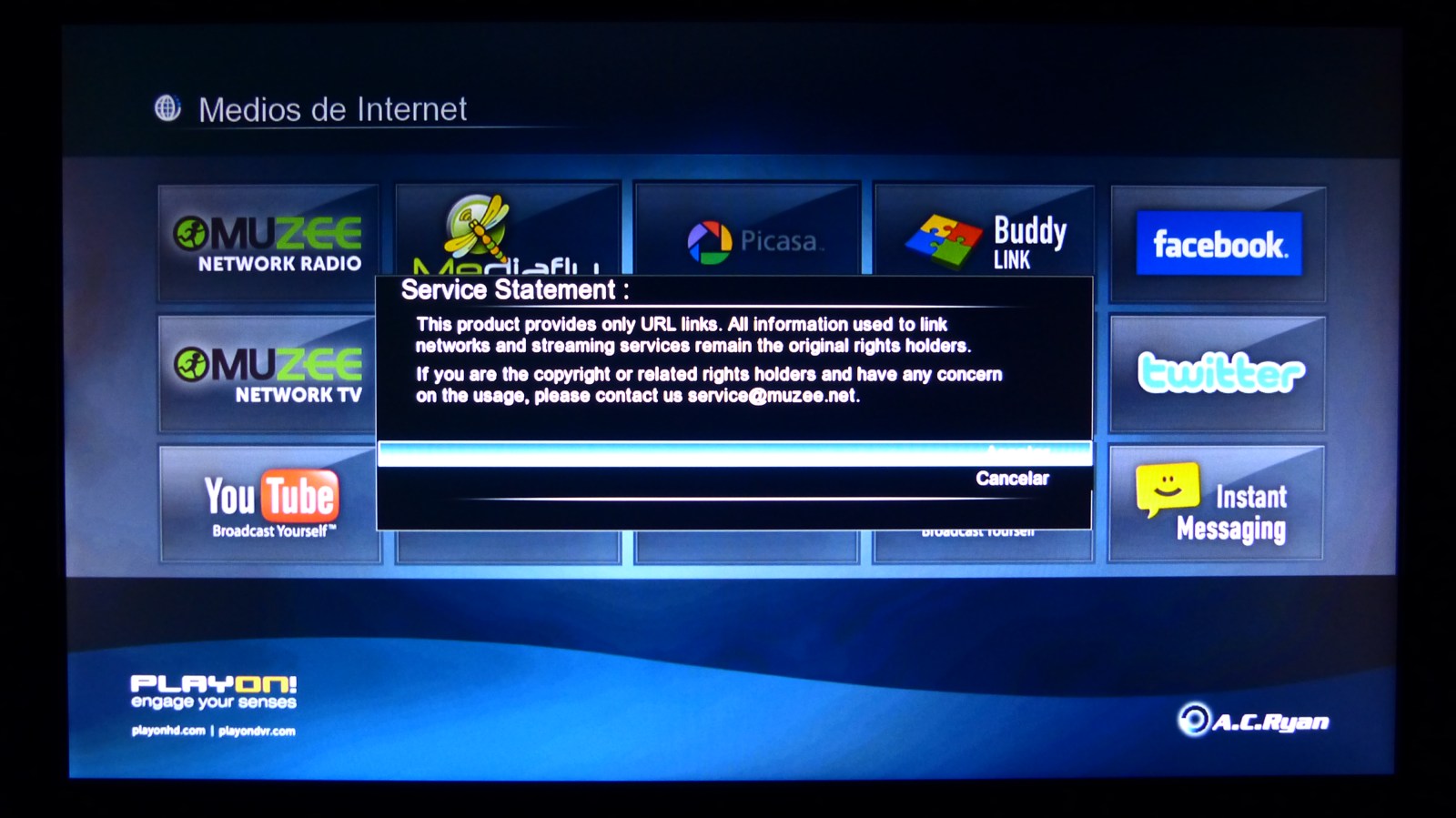A. C. RYAN PLAYON! HD2. Captura Interfaz GUI 2.0 Menú Medios de Internet Preinstalados