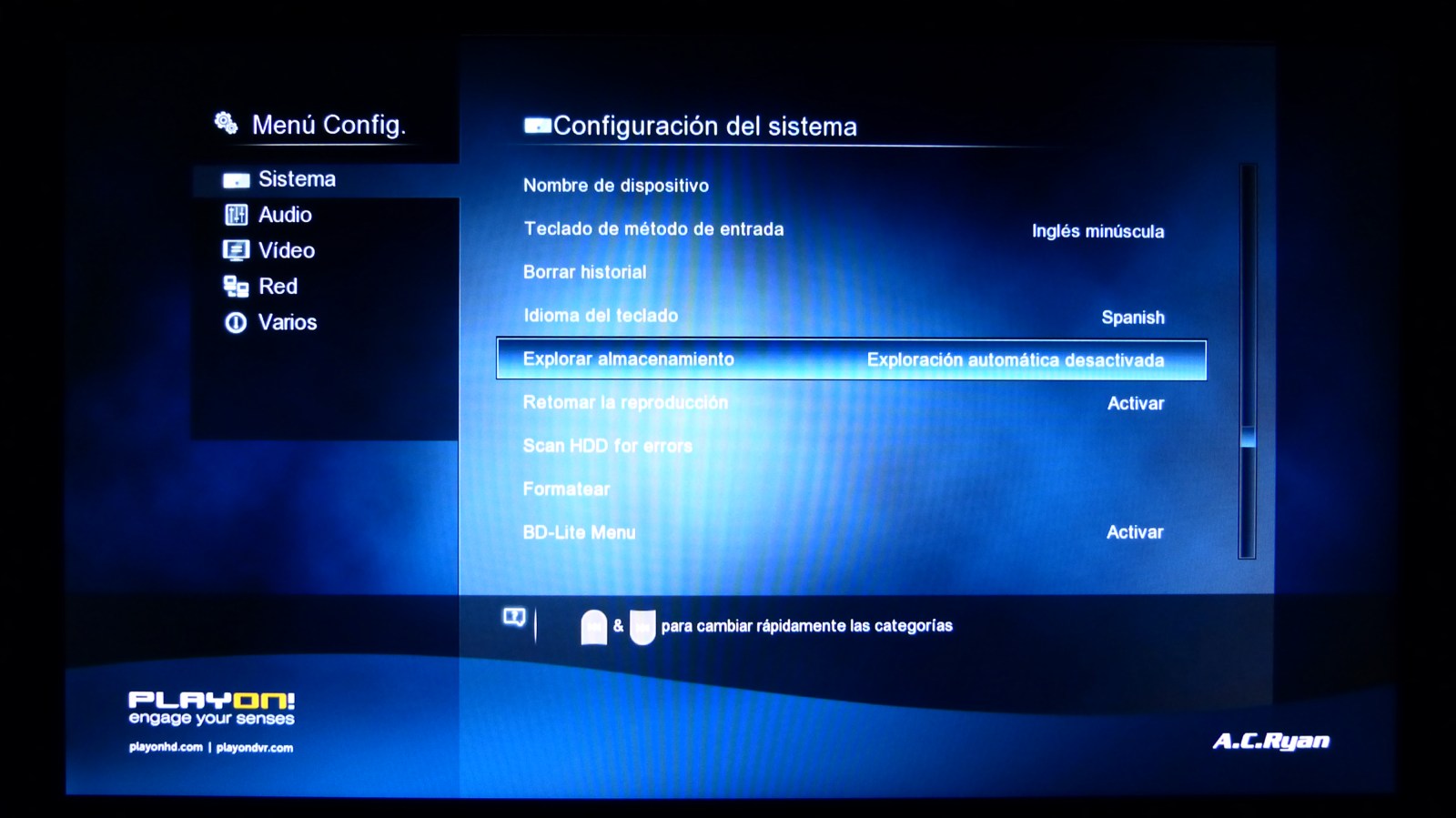 A. C. RYAN PLAYON! HD2. Captura Interfaz GUI 2.0 Navegación en Submenú en Configuración del Sistema I