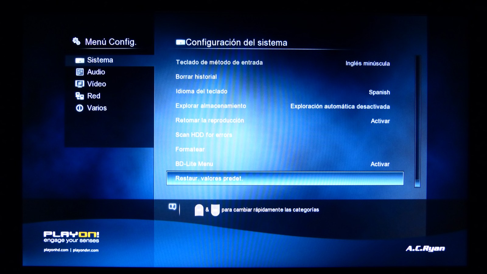 A. C. RYAN PLAYON! HD2. Captura Interfaz GUI 2.0 Navegación en Submenú en Configuración del Sistema III