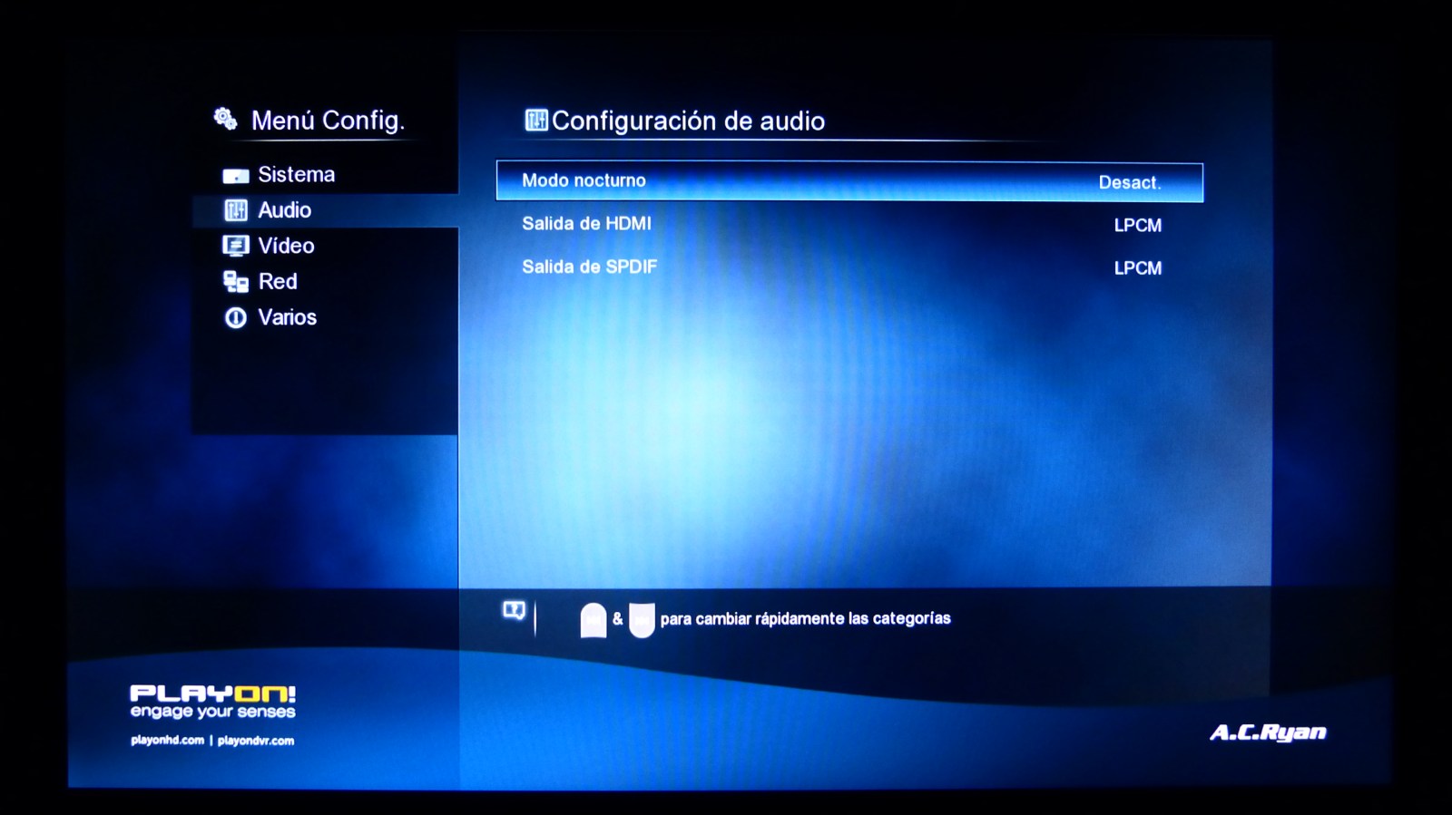 A. C. RYAN PLAYON! HD2. Captura Interfaz GUI 2.0 Navegación en Submenú en Configuración de Audio