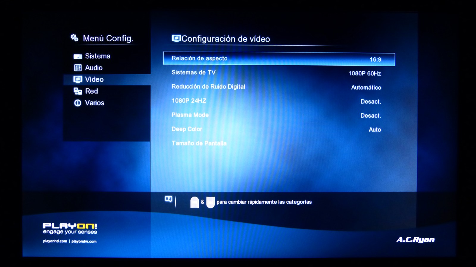 A. C. RYAN PLAYON! HD2. Captura Interfaz GUI 2.0 Navegación en Submenú en Configuración de Vídeo