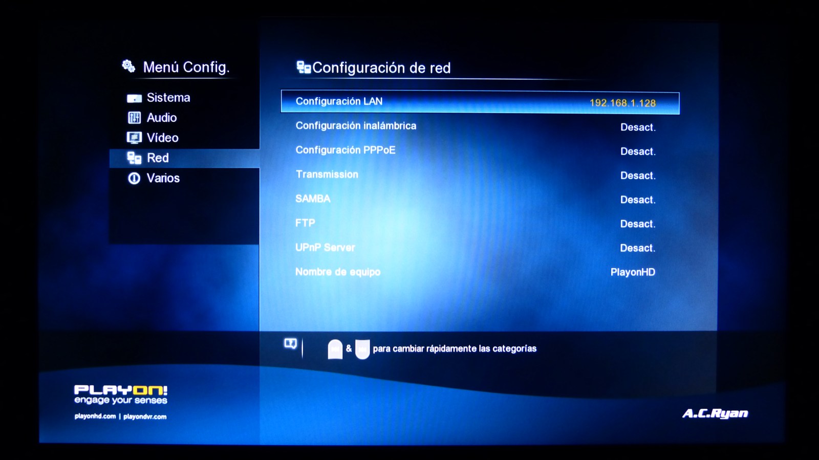 A. C. RYAN PLAYON! HD2. Captura Interfaz GUI 2.0 Navegación en Submenú en Configuración de Red