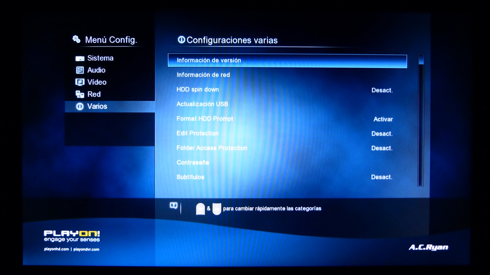 A. C. RYAN PLAYON! HD2. Captura Interfaz GUI 2.0 Navegación en Submenú en Configuraciones Varias