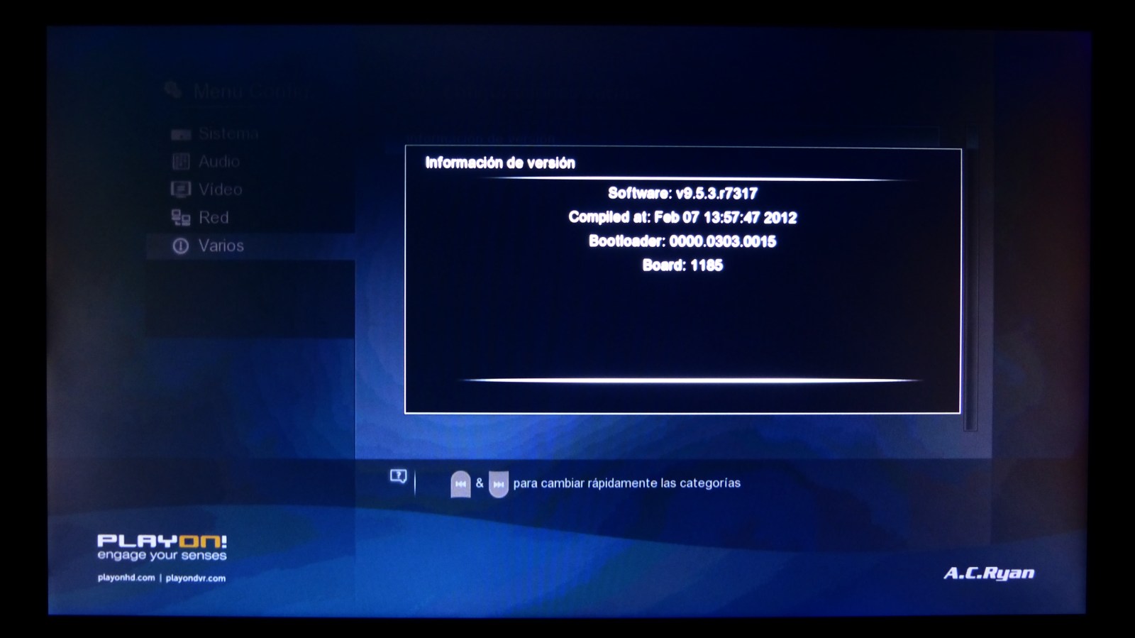 A. C. RYAN PLAYON! HD2. Captura Interfaz GUI 2.0 Acceso Información de la Versión del Firmware ver. v9.5.3.r7317