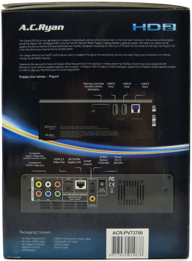 A. C. RYAN PLAYON! HD2. Embalaje Vista Trasera