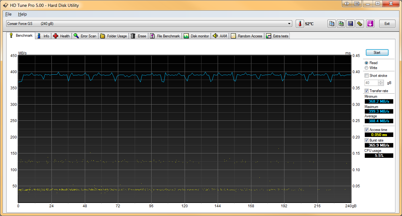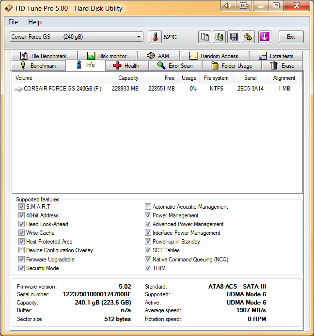 CORSAIR FORCE GS 240GB. Software HD Tune Pro v5.00. Captura «Info». Temperatura de 52ºC