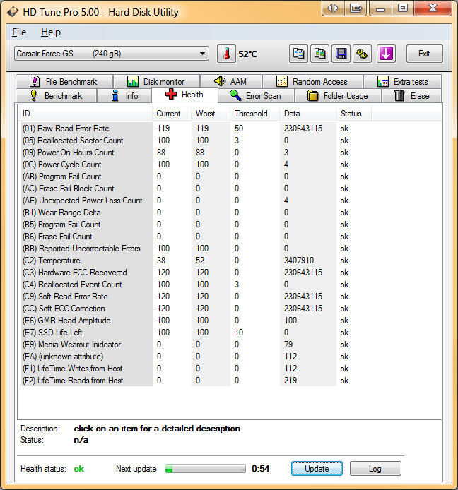 CORSAIR FORCE GS 240GB. Software HD Tune Pro v5.00. Captura «Health»