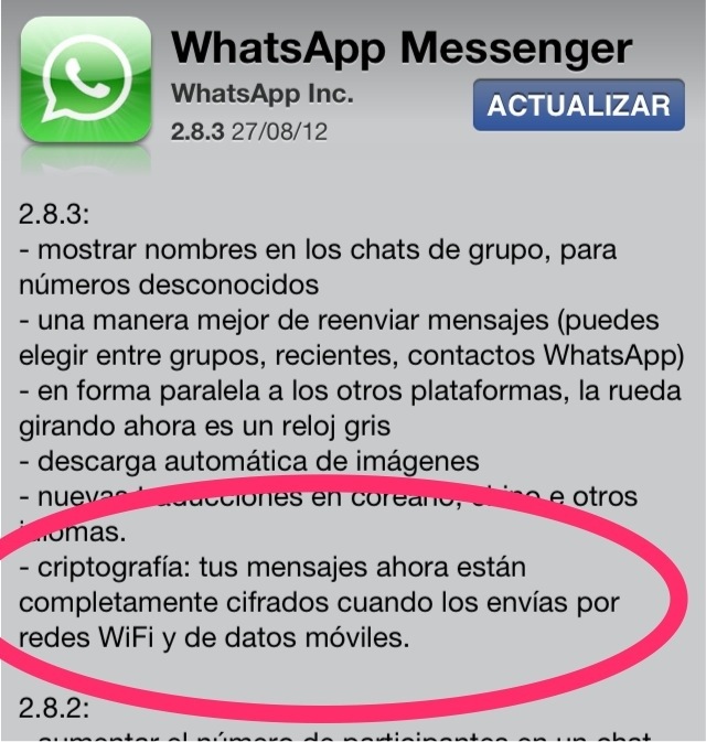 Esta medida llega gracias a que se descubrió que los dispositivos Android que contaran con permisos Root y una aplicación en específico, podían acceder a los mensajes en Whatsapp de otras personas mientras estuvieran ambos conectados a una red no segura. La empresa responsable de esta aplicación tomó cartas en el asunto y ahora esto es imposible gracias al cifrado de los mismos. No dudéis en actualizar a través de la tienda virtual de aplicaciones de vuestro dispositivo.
