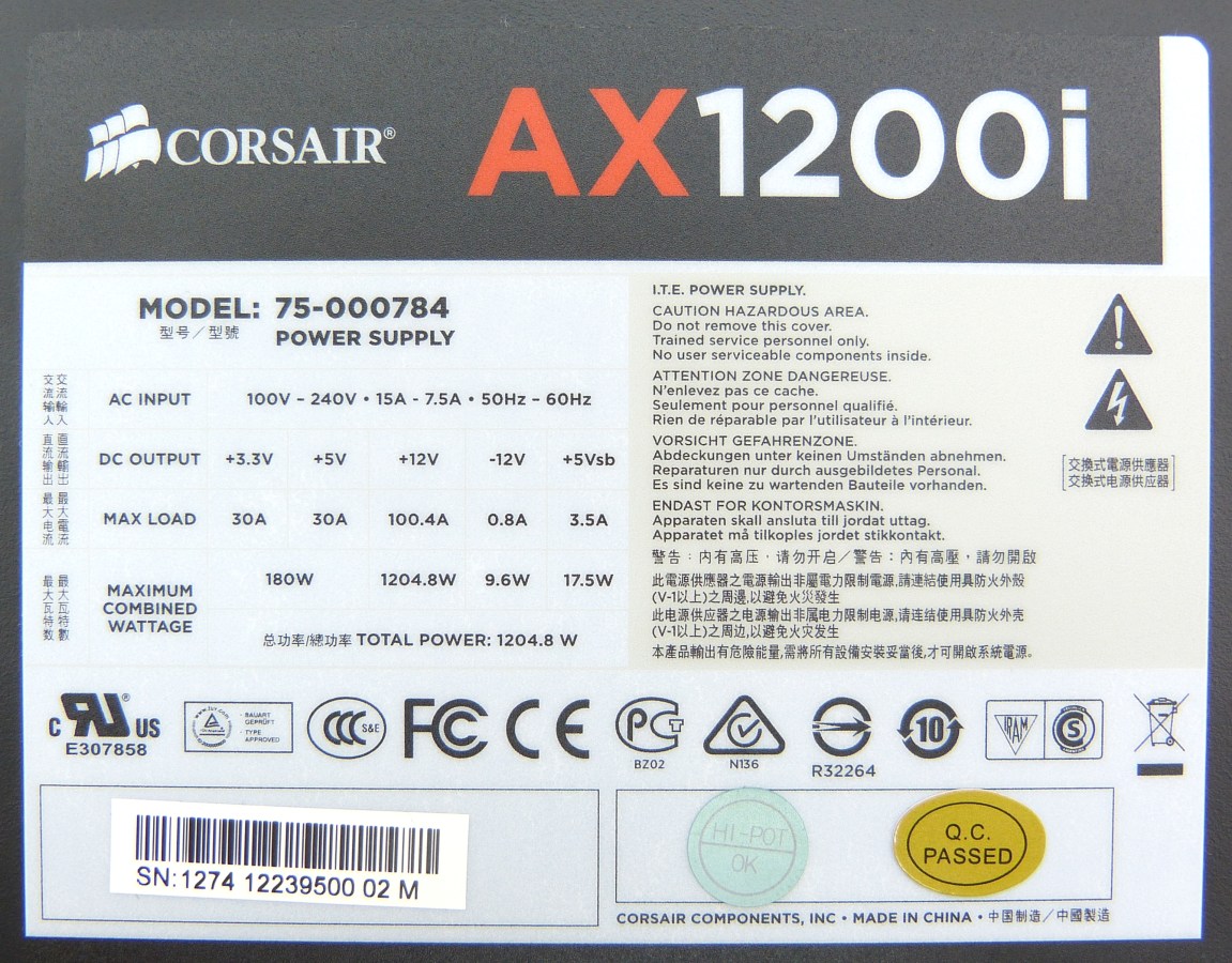 CORSAIR AX1200I. Detalle Pegatina Especificaciones Técnicas y de Control