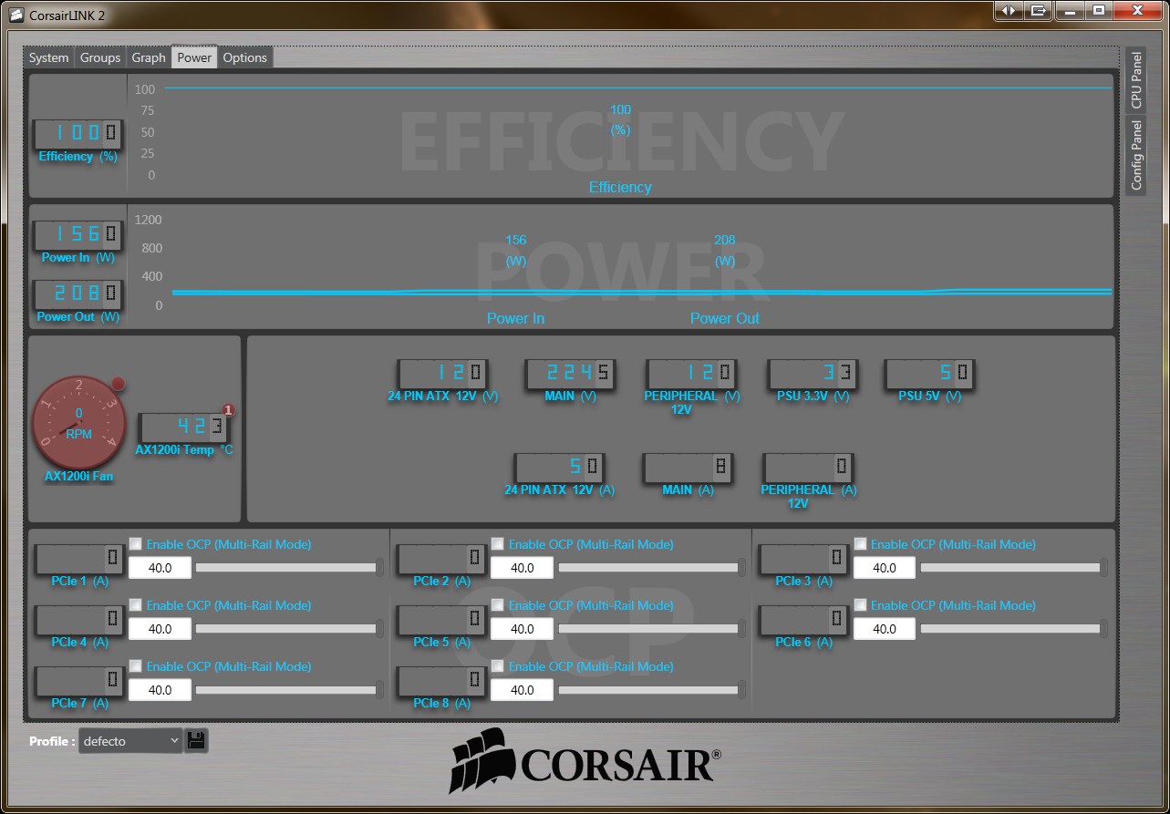 CORSAIR AX1200I. Captura Software Corsair Link 2 v2.0.15 Beta. Sección de «Power»