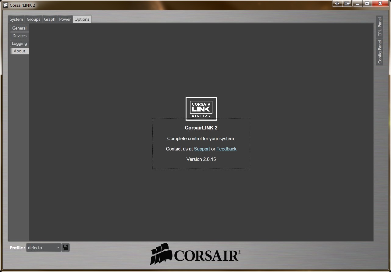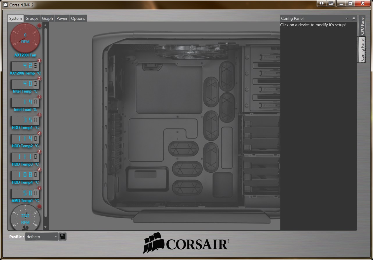 CORSAIR AX1200I. Captura Software Corsair Link 2 v2.0.15 Beta. Sección de «System/Config Panel»