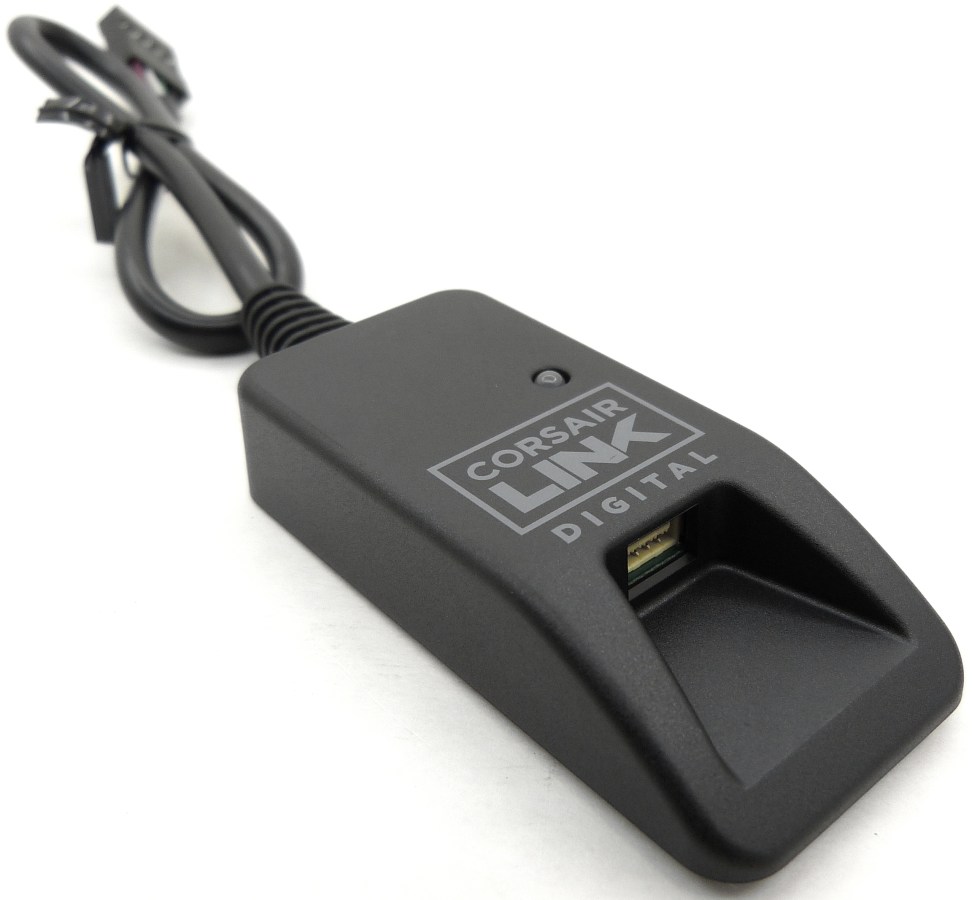 CORSAIR AX1200I. Detalle Adaptador Corsair Link Digital Vista en Perspectiva Delantera. Conector y LED de Estado (Verde/Rojo)